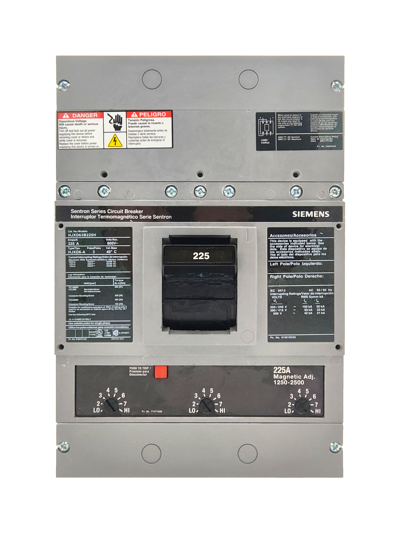 HJD Frame Style, Molded Case Circuit Breaker, High Interrupting Capacity, 100% Rated, Thermal Magnetic Non-Interchangeable Trip Unit, 225 Ampere at 40 Degree Celsius, 3 Pole, 240V AC, 480V AC, and 600V AC @ 50/60 HZ, Interrupting Ratings: 100 Kiloampere @ 240V AC, 65 Kiloampere @ 480V AC, 35 Kiloampere @ 600V AC, 30 Kiloampere @ 250V DC, Without Terminals Standard